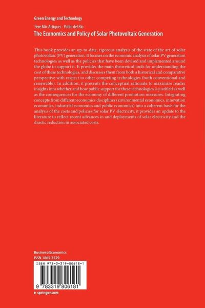 This book provides an up-to-date, rigorous analysis of the state of the art of solar photovoltaic (PV) generation. It focuses on the economic analysis of solar PV generation technologies as well as the policies that have been devised and implemented around the globe to support it. It provides the main theoretical tools for understanding the cost of these technologies, and discusses them from both a historical and comparative perspective with respect to other competing technologies (both conventional and renewable). In addition, it presents the conceptual rationale to maximize reader insights into whether and how public support for these technologies is justified as well as the consequences for the economy of different promotion measures. Integrating concepts from different economics disciplines (environmental economics, innovation economics, industrial economics and public economics) into a coherent basis for the analysis of the costs and policies for solar PV electricity, it providesan update to the literature to reflect recent advances in and deployments of solar electricity and the drastic reduction in associated costs.