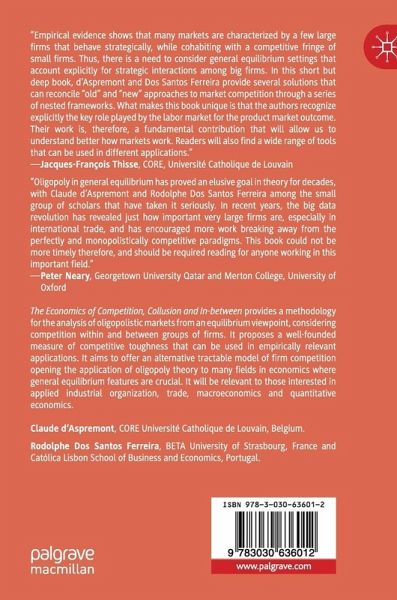 Relative to the dominant model of monopolistic competition, The Economics of Competition, Collusion and In-between aims to explore an alternative tractable model of firm competition opening the application of oligopoly theory to many fields in economics where general equilibrium features are crucial. It will be relevant to those interested in applied industrial organization, trade, macroeconomics (in particular macrodynamics) and quantitative economics.