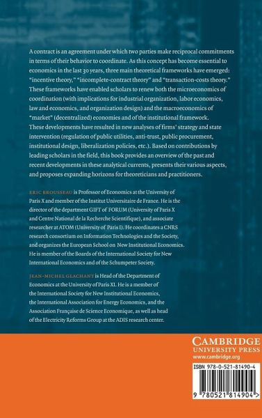 A contract is an agreement under which two parties make reciprocal commitments in terms of their behavior to coordinate. As this concept has become essential to economics in the last 30 years, three main theoretical frameworks have emerged: 'incentive theory', 'incomplete-contract theory' and 'transaction-costs theory'. These frameworks have enabled scholars to renew both the microeconomics of coordination (with implications for industrial organization, labor economics, law and economics, organization design) and the macroeconomics of 'market' (decentralized) economies and of the institutional framework. These developments have resulted in new analyses of a firm's strategy and State intervention (regulation of public utilities, anti-trust, public procurement, institutional design, liberalization policies, etc.). Based on contributions by the leading scholars in the field, this 2002 book provides an overview of developments in these analytical currents, presents their various aspects, and proposes expanding horizons for theoreticians and practitioners.
