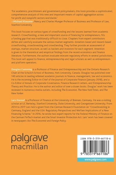 This book focuses on various types of crowdfunding and the lessons learned from academic research. Crowdfunding, a new and important source of financing for entrepreneurs, fills a funding gap that was traditionally difficult to close. Chapters from expert contributors define and carefully evaluate the various market segments: donation-based and reward-based crowdfunding, crowdinvesting and crowdlending. They further provide an assessment of startups, market structure, as well as backers and investors for each segment. Attention is given to the theoretical and empirical findings from the recent economics and finance literature. Furthermore, the authors evaluate relevant regulatory efforts in several jurisdictions. This book will appeal to finance, entrepreneurship and legal scholars as well as entrepreneurs and platform operators.