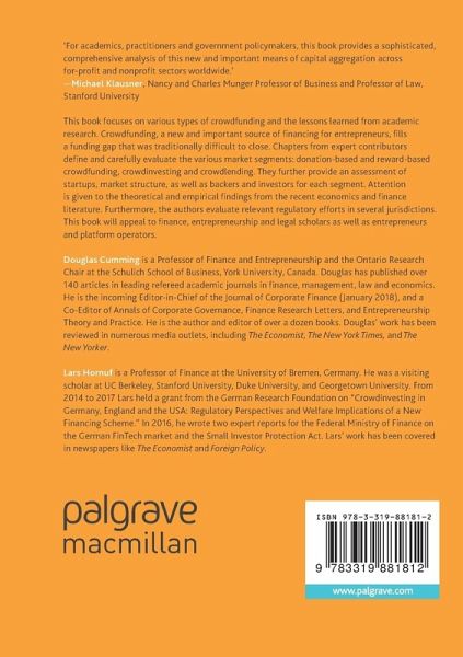1: Introduction.- Part I Startups.- 2: Crowdfunding as a New Financing Tool.- 3: Signaling to Overcome Inefficiencies in Crowdfunding Markets.- 4: The Crowd-Entrepreneur Relationship in Startup Financing.- 5: Fraudulent Behavior by Entrepreneurs and Borrowers.- Part II Market Structure.- 6: Fintech and the Financing of SMEs and Entrepreneurs: From Crowdfunding to Marketplace Lending.- Part III Backers and Investors.- 7: Crowdfunding as a Font of Entrepreneurship: Outcomes of Reward-Based Crowdfunding.- 8: Crowdfunding Creative Ideas: The Dynamics of Project Backers.- Part IV Recent Regulatory Efforts.- 9: The Regulation of Crowdfunding in the United States. 10: The Regulation of Crowdfunding in Europe.- 11: Individual Investors' Access to Crowdinvesting: Two Regulatory Models.