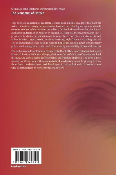 This book is a collection of academic lectures given on fintech, a topic that has been written about extensively but only from a business or technological point of view. In contrast to other publications on the subject, this book shows the reader how fintech should be understood in relation to economics, financial theory, policy, and law. It provides introductory explanations on fintech-related concepts and instruments such as blockchains, crypto assets, machine learning, high-frequency trading, and AI. The collected lectures also point to surrounding issues including start-ups, monetary policy, asset management, cyber and other security, and stability of financial systems.