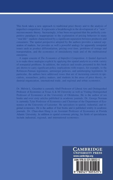 This book takes a different approach to traditional price theory and to the analysis of imperfect competition. It represented a breakthrough in the development of a 'new' microeconomic theory. Increasingly, it has been recognized that the perfectly competitive paradigm is inappropriate to the explanation of pricing behaviour in many 'real life' markets characterized by a significant separation between producers and consumers. The spatial perspective adopted by the authors provides a natural separation of markets, but provides as well a powerful analogy for apparently nonspatial issues such as product differentiation, pricing over time, problems of storage and transportation, and the economics of intraindustry trade and of the multinational enterprise. A major concern of The Economics of Imperfect Competition: A Spatial Approach is to make these analogies explicit by applying this spatial analysis to a wide variety of nonspatial problems.
