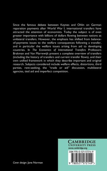 Since the famous debate between Keynes and Ohlin on German reparation payments after World War I, international transfers have attracted the attention of economists. Today the subject is of even greater importance with billions of dollars flowing between nations as unilateral transfers. However the emphasis has shifted from balance-of-payments issues to the welfare consequences following a transfer and in particular the welfare issues arising from aid to developing countries. In The Economics of International Transfers, first published in 1998, Professors Brakman and van Marrewijk present an overview of transfers (including the history of transfers and current transfer flows) and their own unified framework in which they present important and original research. Subjects considered include welfare effects, distortions, third parties, rent-seeking, the 'trade or aid' discussion, multi-lateral agencies, tied aid and imperfect competition.