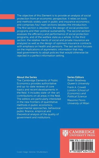 This Element provides an analysis of social protection from an economic perspective. It describes the design of social protection programs, assesses the efficiency and performance of social protection programs, analyzes the relative merits of social and private insurance, and focuses on the implications of asymmetric information.