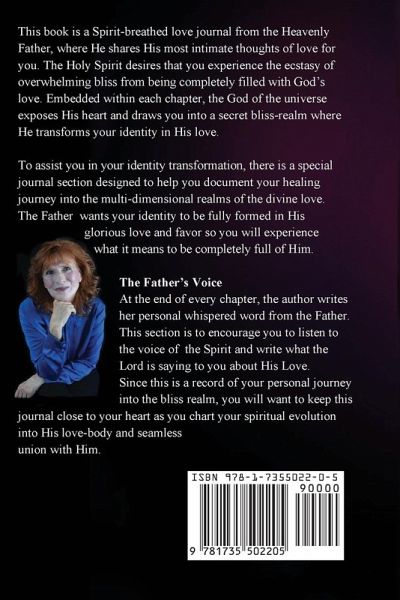 This book is a Spirit-breathed love journal from the Heavenly Father, where He shares His most intimate thoughts of love for you. The Holy Spirit desires that you experience the ecstasy of overwhelming bliss from being completely filled with God's love. Embedded within each chapter, the God of the universe exposes His heart and draws you into a secret bliss-realm where He transforms your identity in His love. To assist you in your identity transformation, there is a special journal section designed to help you document your healing journey into the multi-dimensional realms of the divine love. The Father wants your identity to be fully formed in His glorious love and favor so you will experience what it means to be completely full of Him. The Father's Voice At the end of every chapter, the author writes her personal whispered word from the Father. This section is to encourage you to listen to the voice of the Spirit and write what the Lord is saying to you about His Love. Since this is a record of your personal journey into the bliss realm, you will want to keep this journal close to your heart as you chart your spiritual evolution into His love-body and seamless union with Him.