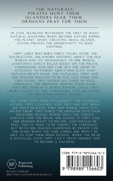 The Naturals. Pirates hunt them. Islanders fear them. Orphans pray for them. In 2104, mankind witnessed the first of many natural disasters when Mother Nature ripped the planet apart, creating small islands, giving pirates the opportunity to seize control. Tippy Lopez was born forty years after the destruction. She knows nothing about the old world and its technology. In her world, everyone's safety relies solely on the Pirate Commodore and her law. But she grew up listening to stories about one clan that refused pirate rules. The Naturals. Tippy and her friends wanted to be just like them. For two years, they helped all those in need, especially the orphans. During every raid, they hid them in a secret bunker, until they were caught by the Commodore and sentenced to ten years mining sulfur. Six years into their punishment, the Naturals attack Tippy's cavern, and they are not what she once believed. They are worse than any pirate crew. They force the orphans into four gruesome phases, where only the strong survive and the weak are killed. If Tippy and her friends want to escape, and finally be free, they'll need to be among the strongest. But with her friends hardened by prison life, she fears when the time comes, she won't be able to stop them from joining. When the prize is revealed, even Tippy can't trust herself not to become a Natural.
