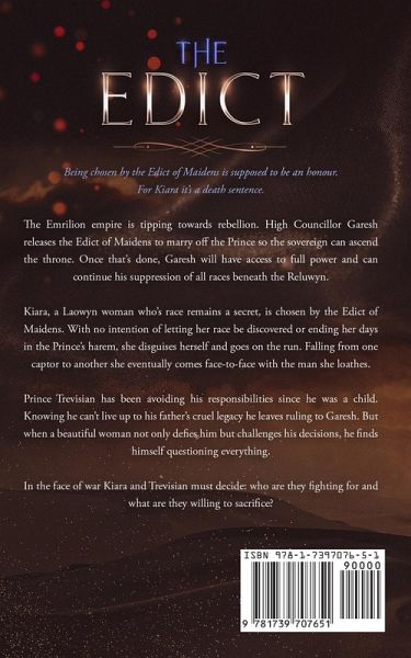 Being chosen by the Edict of Maidens is supposed to be an honour. For Kiara it's a death sentence. The Emrilion empire is tipping towards rebellion. High Councillor Garesh releases the Edict of Maidens to marry off the Prince so the sovereign can ascend the throne. Once that's done, Garesh will have access to full power and can continue his suppression of all races beneath the Reluwyn. Kiara, a Laowyn woman who's race remains a secret, is chosen by the Edict of Maidens. With no intention of letting her race be discovered or ending her days in the Prince's harem, she disguises herself and goes on the run. Falling from one captor to another she eventually comes face-to-face with the man she loathes. Prince Trevisian has been avoiding his responsibilities since he was a child. Knowing he can't live up to his father's cruel legacy he leaves ruling to Garesh. But when a beautiful woman not only defies him but challenges his decisions, he finds himself questioning everything. In the face of war Kiara and Trevisian must decide: who are they fighting for and what are they willing to sacrifice?