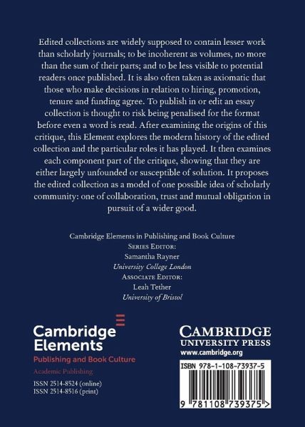 Edited collections are widely supposed to contain lesser work than scholarly journals. After examining the origins of this critique, this Element explores the modern history of the edited collection and the particular roles it has played as a model of collaboration, trust and mutual obligation.