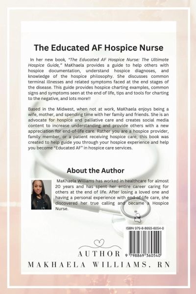 The Educated AF Hospice Nurse In this book you will find the following: Documentation Best PracticesDocumentation Hacks How to spend less time on charting.*Tips on documenting at the bedside* Documenting FormatULTIMATE HACK "Patient Cheat Sheet." Example IDT Note Example RECERT Note Example Admission Note Example Death Note Example Respite Note Example Continuous Care Note Painting the Picture-signs and symptoms of each diagnosis with SOAP format chartingHeart Failure Alzheimer's/Dementia Cancer Debility Renal Failure Liver Failure CVA COPD Parkinson's Protein Calorie Malnutrition Senile Degeneration of the Brain Atherosclerosis Neurological Disorders And more... Charting ToolsDuties of the Hospice Chaplain and Hospice Social Worker Palliative Care vs Hospice Care My Version of the PPS Scale Pressure Sore Scale BMI Calculator MMSE Scale FAST Scale NYHA Scale Signs and Symptoms of Pain ADLS *I-ADLS Pain medications Signs and Symptoms of Death and Dying Examples of Comparative Data