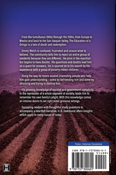 From the tumultuous 1960s through the 1990s, from Europe to Mexico and back to the San Joaquin Valley, The Education of a Gringo is a tale of doubt and redemption. It tells the story of Jimmy Welch who is confused, frustrated and unsure what to do when he is encouraged to reject and discriminate against Mexican immigrants. At first he joins in rejecting and disregarding them, but he has doubts which cause him to question his and the community's behavior. Becoming a teacher in an elementary school with a student body comprised primarily of children of Mexican farmworkers begins to change his attitudes and beliefs. He draws on his recent exposure to different cultures while traveling in Europe and begins to want to learn about the children and their families, who have a very different world view from the society around them. In this quest he travels to Mexico, gains knowledge of the culture and learns Spanish. Through a politically connected friend he learns of U.S. government complicity in the repression of farmworkers and sets out to act as an advocate for them.