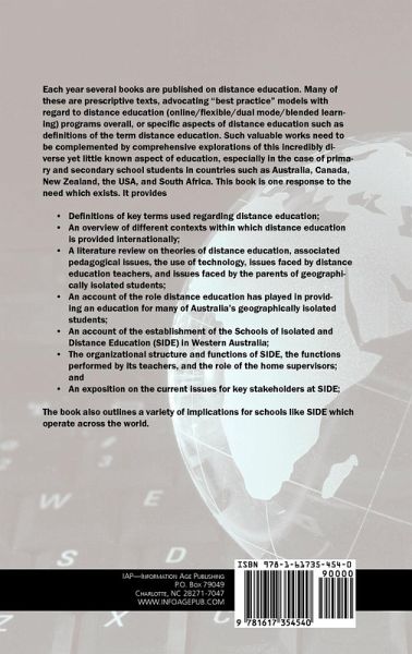 Australia is a vast sparsely populated land and from an early date this created problems in terms of providing educational facilities. As part of the solution the nation has had a long tradition of using distance education methods to provide an education for its isolated primary and secondary school students. Western Australia epitomises the problems inherent in having a large land area with a highly urbanised population and a small but scattered rural one. Initially, the State established a Correspondence School in 1918. There have been various developments since then, culminating in the establishment of the Schools of Isolated and Distance Education (SIDE) in 1995. Since then the staff at SIDE have investigated and developed ways of providing their students with innovative educational materials in an effort to ensure that the best possible services are provided. Despite its innovative nature, very little research has been conducted on SIDE. The research project reported in this book is one contribution to rectifying the deficit. It had three main aims. The first was to develop an understanding of the emergence of SIDE. Secondly, an understanding of the key functions of SIDE was sought. The third aim was to develop an understanding of the issues which present themselves for those working at SIDE.. Implications for policy, practice and future research in relation to the education of children in geographically remote regions through distance education are deduced, and not just in relation to the state of Western Australia, but internationally.