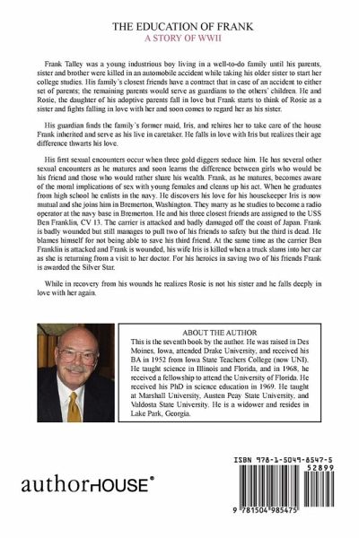 THE EDUCATION OF FRANK A STORY OF WWII Frank Talley was a young industrious boy living in a well-to-do family until his parents, sister and brother were killed in an automobile accident while taking his older sister to start her college studies. His family's closest friends have a contract that in case of an accident to either set of parents; the remaining parents would serve as guardians to the others' children. He and Rosie, the daughter of his adoptive parents fall in love but Frank starts to think of Rosie as a sister and fights falling in love with her and soon comes to regard her as his sister. His guardian finds the family's former maid, Iris, and rehires her to take care of the house Frank inherited and serve as his live in caretaker. He falls in love with Iris but realizes their age difference thwarts his love. His first sexual encounters occur when three gold diggers seduce him. He has several other sexual encounters as he matures and soon learns the difference between girls who would be his friend and those who would rather share his wealth. Frank, as he matures, becomes aware of the moral implications of sex with young females and cleans up his act. When he graduates from high school he enlists in the navy. He discovers his love for his housekeeper Iris is now mutual and she joins him in Bremerton, Washington. They marry as he studies to become a radio operator at the navy base in Bremerton. He and his three closest friends are assigned to the USS Ben Franklin, CV 13. The carrier is attacked and badly damaged off the coast of Japan. Frank is badly wounded but still manages to pull two of his friends to safety but the third is dead. He blames himself for not being able to save his third friend. At the same time as the carrier Ben Franklin is attacked and Frank is wounded, his wife Iris is killed when a truck slams into her car as she is returning from a visit to her doctor. For his heroics in saving two of his friends Frank is awarded the Silver Star. While in recovery from his wounds he realizes Rosie is not his sister and he falls in deeply in love with her again.