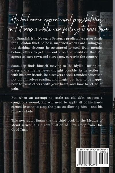 He had never experienced possibilities - and it was a whole new feeling to have them. Pip Standish is in Newgate Prison, a predictable career finale for a London thief. So he is surprised when Lord Finlington, the dashing viscount he attempted to steal from months before, offers to get him out - on the condition that Pip agrees to leave town and start a new career in the country. Soon, Pip finds himself moving to the idyllic Tutting-on-Cress and a life he never thought possible. As he settles in with his new friends, he discovers a well-rounded education not only involves reading and magic, but how to be happy, how to trust others with your heart, and how to let go of pain. But when an attempt to settle an old debt reopens a dangerous wound, Pip will need to apply all of his hard-earned lessons to stop the past swallowing him - and his future - whole. This new adult fantasy is the third book in the Meddle & Mend series. It is a continuation of Pip's story from One Good Turn.
