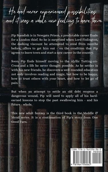 He had never experienced possibilities - and it was a whole new feeling to have them. Pip Standish is in Newgate Prison, a predictable career finale for a London thief. So he is surprised when Lord Finlington, the dashing viscount he attempted to steal from months before, offers to get him out - on the condition that Pip agrees to leave town and start a new career in the country. Soon, Pip finds himself moving to the idyllic Tutting-on-Cress and a life he never thought possible. As he settles in with his new friends, he discovers a well-rounded education not only involves reading and magic, but how to be happy, how to trust others with your heart, and how to let go of pain. But when an attempt to settle an old debt reopens a dangerous wound, Pip will need to apply all of his hard-earned lessons to stop the past swallowing him - and his future - whole. This new adult fantasy is the third book in the Meddle & Mend series. It is a continuation of Pip's story from One Good Turn.