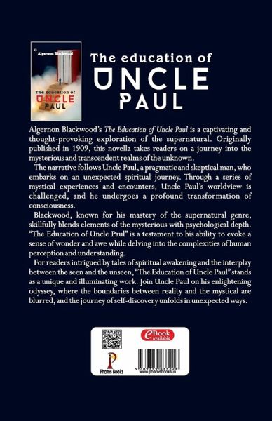 Algernon Blackwood's "The Education of Uncle Paul" is a captivating and thought-provoking exploration of the supernatural. Originally published in 1909, this novella takes readers on a journey into the mysterious and transcendent realms of the unknown.The narrative follows Uncle Paul, a pragmatic and skeptical man, who embarks on an unexpected spiritual journey. Through a series of mystical experiences and encounters, Uncle Paul's worldview is challenged, and he undergoes a profound transformation of consciousness.Blackwood, known for his mastery of the supernatural genre, skillfully blends elements of the mysterious with psychological depth. "The Education of Uncle Paul" is a testament to his ability to evoke a sense of wonder and awe while delving into the complexities of human perception and understanding.For readers intrigued by tales of spiritual awakening and the interplay between the seen and the unseen, "The Education of Uncle Paul" stands as a unique and illuminating work. Join Uncle Paul on his enlightening odyssey, where the boundaries between reality and the mystical are blurred, and the journey of self-discovery unfolds in unexpected ways.