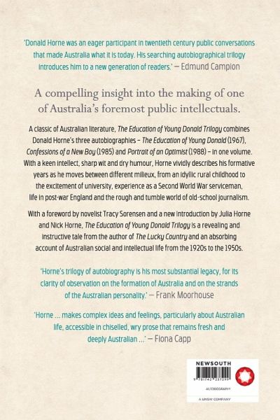 A compelling insight into the making of one of Australia's foremost public intellectuals. A classic of Australian literature, The Education of Young Donald Trilogy combines Donald Horne's three autobiographies - The Education of Young Donald (1967), Confessions of a New Boy (1985) and Portrait of an Optimist (1988) - in one volume. With a keen intellect, sharp wit and dry humour, Horne vividly describes his formative years as he moves between different millieux, from an idyllic rural childhood to the excitement of university, experience as a Second World War serviceman, life in post-war England and the rough and tumble world of old-school journalism. With a foreword by novelist Tracy Sorensen and a new introduction by Julia Horne and Nick Horne, The Education of Young Donald Trilogy is a revealing and instructive tale from the author of The Lucky Country and an absorbing account of Australian social and intellectual life from the 1920s to the 1950s. 'Donald Horne looks down on Australia from the loftiest heights in the pantheon. He's up there with Patrick White as our most savage literary lion. The Education of Young Donald Trilogy is a masterpiece and should replace the Gideon Bible in motel drawers.' - Phillip Adams 'Donald Horne was an eager participant in twentieth century public conversations that made Australia what it is today. His searching autobiographical trilogy introduces him to a new generation of readers.' - Edmund Campion 'Horne's trilogy of autobiography is his most substantial legacy, for its clarity of observation on the formation of Australia and on the strands of the Australian personality.' - Frank Moorhouse '... a superb book.' Peter Coleman, - The Australian 'I commend it to you quite fiercely.' - Max Harris, The Australian '... an exhilarating inquiry into the sources and quality of the facts and ideas that made him ...' - H.G. Kippax, Sydney Morning Herald 'In some ways, his personality embodied the Australia into which he was born in 1921: hard edged, wry-humoured, industrious and pragmatic. In a country with a deeply ingrained anti-intellectual tradition ... Horne was a feisty advocate for the virtues of intellectual life.' - Mark McKenna, The Australian 'Australia had made him and he was concerned to remake Australia ... it was his country and as such it had no right to be boring or provincial or mediocre.' - Owen Harries, Speech at Horne Memorial 'Like Henry Lawson and Patrick White, his work will live on as a faithful record of our time.' - Manning Clark