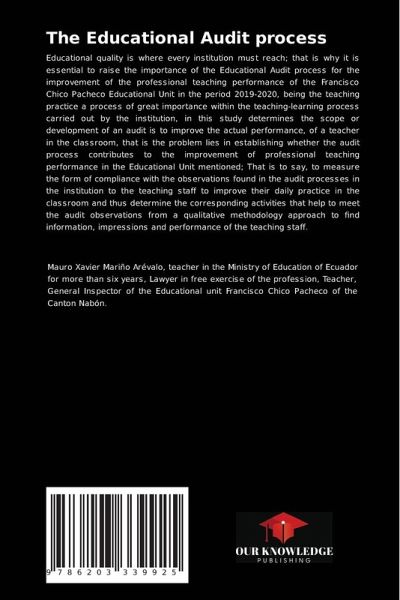 Educational quality is where every institution must reach; that is why it is essential to raise the importance of the Educational Audit process for the improvement of the professional teaching performance of the Francisco Chico Pacheco Educational Unit in the period 2019-2020, being the teaching practice a process of great importance within the teaching-learning process carried out by the institution, in this study determines the scope or development of an audit is to improve the actual performance, of a teacher in the classroom, that is the problem lies in establishing whether the audit process contributes to the improvement of professional teaching performance in the Educational Unit mentioned; That is to say, to measure the form of compliance with the observations found in the audit processes in the institution to the teaching staff to improve their daily practice in the classroom and thus determine the corresponding activities that help to meet the audit observations from a qualitative methodology approach to find information, impressions and performance of the teaching staff.