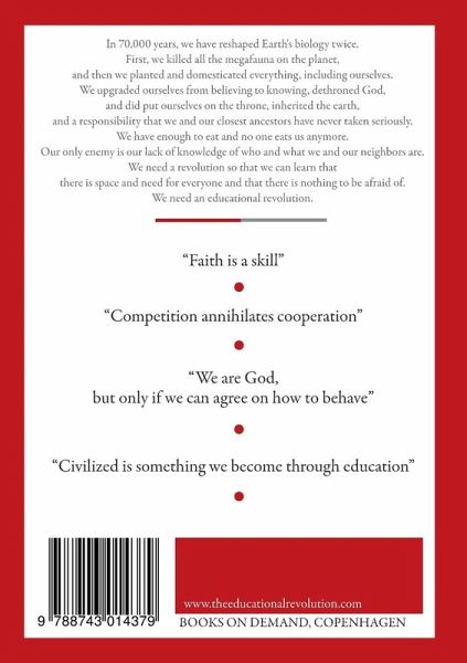 In 70,000 years, we have reshaped Earth's biology twice. First, we killed all the megafauna on the planet, and then we planted and domesticated everything, including ourselves. We upgraded ourselves from believing to knowing, dethroned God, and did put ourselves on the throne, inherited the earth, and a responsibility that we and our closest ancestors have never taken seriously. We have enough to eat and no one eats us anymore. Our only enemy is our own lack of knowledge of who and what we and our neighbors really are. We need a revolution so that we can learn that there is space and need for everyone and that there is really nothing to be afraid of. We need an educational revolution.