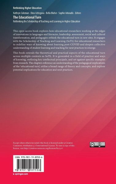 This open access book explores how educational researchers working at the edges of innovations in languages and literacies, leadership, assessment, social and cultural transformation, and pedagogies rethink the educational turn in new sites. It engages with the Scholarship of Teaching and Learning (SoTL) for educational researchers to redefine ways of knowing about learning post-COVID and deepen collective understanding of student learning and teaching for next practices to emerge.