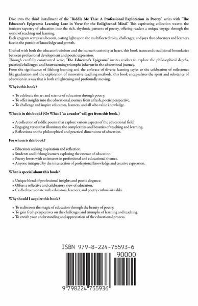 Dive into the third installment of the "Riddle Me This: A Professional Exploration in Poetry" series with "The Educator's Epigrams: Learning Lore in Verse for the Enlightened Mind." This captivating collection weaves the intricate tapestry of education into the rich, rhythmic patterns of poetry, offering readers a unique voyage through the world of teaching and learning. Each epigram serves as a beacon, casting light upon the multifaceted roles, challenges, and joys that educators and learners face in the pursuit of knowledge and growth. Crafted with both the educator's wisdom and the learner's curiosity at heart, this book transcends traditional boundaries between professional development and poetic expression. Through carefully constructed verse, "The Educator's Epigrams" invites readers to explore the philosophical depths, practical challenges, and heartwarming triumphs inherent in the educational journey. From the significance of lifelong learning and the embrace of diverse learning styles to the celebration of milestones like graduation and the exploration of innovative teaching methods, this book encapsulates the spirit and substance of education in a way that is both enlightening and profoundly moving. Why is this book?To celebrate the art and science of education through poetry. To offer insights into the educational journey from a fresh, poetic perspective. To challenge and inspire educators, learners, and all who value knowledge. What is in this book? (Or What I "as a reader" will get from this book.)A collection of riddle poems that explore various aspects of the educational field. Engaging verses that illuminate the complexities and beauties of teaching and learning. Reflections on the philosophical and practical dimensions of education. For whom is this book?Educators seeking inspiration and reflection. Students and lifelong learners exploring the essence of education. Poetry lovers with an interest in professional and educational themes. Anyone intrigued by the intersection of professional knowledge and creative expression. What is special about this book?Unique blend of professional insights and poetic elegance. Offers a reflective and celebratory view of education. Crafted to resonate with educators, learners, and poetry enthusiasts alike. Why should I acquire this book?To rediscover the magic of education through the beauty of poetry. To gain fresh perspectives on the challenges and triumphs of learning and teaching. To enrich your understanding and appreciation of the educational process.