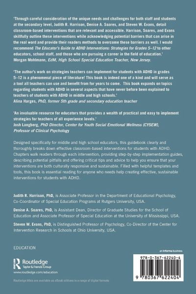 'Through careful consideration of the unique needs and challenges for both staff and students at the secondary level, Judith R. Harrison, Denise A. Soares, and Steven W. Evans, detail classroom-based interventions that are relevant and accessible. Harrison, Soares, and Evans skillfully outline these interventions while acknowledging potential barriers that can arise in the real word and provide their readers methods to overcome these barriers as well. I would recommend The Educator's Guide to ADHD Interventions: Strategies for Grades 5 - 12 to other educators, school staff, and those who are pursuing a career in the field of education.'