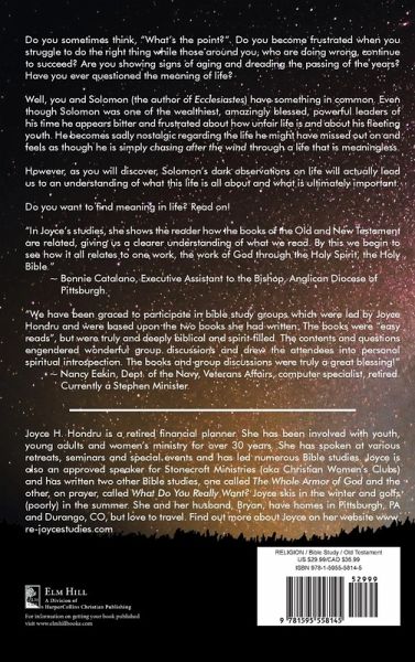 As noted in the introduction of this study, I find Ecclesiastes to be an odd duck. I mean it isn't a book filled with pearls of wisdom, like the book of Proverbs. And it isn't a book filled with praise, like the book of Psalms. Nor, will you find it to be like many of the books in the Old Testament, which give a history of God's chosen the people, the Israelites. And, you won't find any major or minor prophet here either. In fact, this book, with all of the author's laments about the meaninglessness and vanities of life, for the most part, can be downright depressing! Yet we know that all of the books in the Bible are there for a reason. So, while some people shy away from the book of Revelation because of its somewhat frightening and symbolic text and others skim over books like Leviticus, Numbers and Lamentations because of their dry, repetitive or mournful tone, I don't want people, who love God's word, to do the same with this book. I want my readers to see Ecclesiastes in a new light, from a new perspective. Finding a new approach was relatively simple. I didn't consult a bunch of theological, heady books that provided someone else's understanding of what the author, whom I believe to be King Solomon, was trying to say or was feeling when he wrote this book. Instead I simply sat down with my Bible, started reading at the beginning of chapter one and asked the Holy Spirit to open my eyes to what He wanted me and my readers to glean from this most unusual book. The title of the book, E(eek)clesiastes- How to Find Meaning in a Meaningless Life!, came to mind almost immediately. The EEK part, because of how crazy this book it, but the second part, the finding meaning part, because to me, this is the bottom line of what Solomon, consciously or unconsciously, brings to the table in this book. While he struggles throughout the entire twelve chapters of this book with life's meaning he, through this struggle, actually reveals to us what there is in this life that does provide meaning. However, you really have to look for it. In addition, as one of reviewers of this book points out, like all of the books of the Old Testament, Ecclesiastes, is no different in pointing the way to the New Testament and thus to Jesus Christ and life eternal. She notes that I show "the reader how the books of the Old and New Testament are related, giving us a clearer understanding of what we read. By this we begin to see how it all relates to one work, the work of God through the Holy Spirit, the Holy Bible." We have all struggled with the meaning of life. Consider walking through this book as we try to unravel what that meaning might be - together.