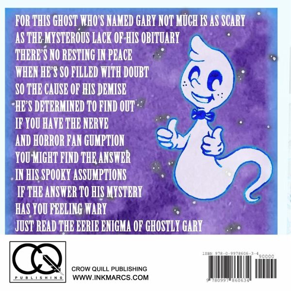 Gary is a ghost who doesn't know how he met his untimely demise. Join him as he explores all the possibilities of a spooky comeuppance. The Eerie Enigma of Ghostly Gary was a painting-a-day challenge from 2019 turned picture book. Most pages in this book have some kind of reference to either a classic monster or a horror film. 31 Water color paintings all compiled into one book to solve the Eerie Enigma of Ghostly Gary.