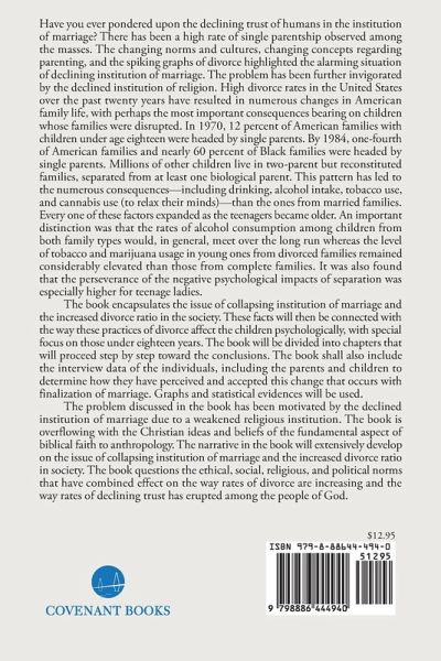Have you ever pondered upon the declining trust of humans in the institution of marriage? There has been a high rate of single parentship observed among the masses. The changing norms and cultures, changing concepts regarding parenting, and the spiking graphs of divorce highlighted the alarming situation of declining institution of marriage. The problem has been further invigorated by the declined institution of religion. High divorce rates in the United States over the past twenty years have resulted in numerous changes in American family life, with perhaps the most important consequences bearing on children whose families were disrupted. In 1970, 12 percent of American families with children under age eighteen were headed by single parents. By 1984, one-fourth of American families and nearly 60 percent of Black families were headed by single parents. Millions of other children live in two-parent but reconstituted families, separated from at least one biological parent. This pattern has led to the numerous consequences--including drinking, alcohol intake, tobacco use, and cannabis use (to relax their minds)--than the ones from married families. Every one of these factors expanded as the teenagers became older. An important distinction was that the rates of alcohol consumption among children from both family types would, in general, meet over the long run whereas the level of tobacco and marijuana usage in young ones from divorced families remained considerably elevated than those from complete families. It was also found that the perseverance of the negative psychological impacts of separation was especially higher for teenage ladies. The book encapsulates the issue of collapsing institution of marriage and the increased divorce ratio in the society. These facts will then be connected with the way these practices of divorce affect the children psychologically, with special focus on those under eighteen years. The book will be divided into chapters that will proceed step by step toward the conclusions. The book shall also include the interview data of the individuals, including the parents and children to determine how they have perceived and accepted this change that occurs with finalization of marriage. Graphs and statistical evidences will be used. The problem discussed in the book has been motivated by the declined institution of marriage due to a weakened religious institution. The book is overflowing with the Christian ideas and beliefs of the fundamental aspect of biblical faith to anthropology. The narrative in the book will extensively develop on the issue of collapsing institution of marriage and the increased divorce ratio in society. The book questions the ethical, social, religious, and political norms that have combined effect on the way rates of divorce are increasing and the way rates of declining trust has erupted among the people of God.