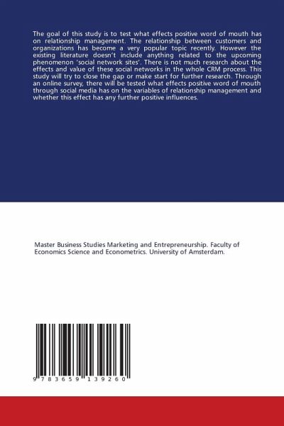 The goal of this study is to test what effects positive word of mouth has on relationship management. The relationship between customers and organizations has become a very popular topic recently. However the existing literature doesn t include anything related to the upcoming phenomenon social network sites . There is not much research about the effects and value of these social networks in the whole CRM process. This study will try to close the gap or make start for further research. Through an online survey, there will be tested what effects positive word of mouth through social media has on the variables of relationship management and whether this effect has any further positive influences.