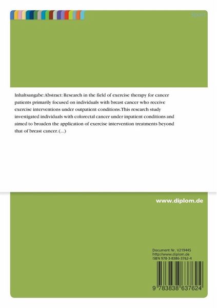 Inhaltsangabe:Abstract: Research in the field of exercise therapy for cancer patients primarily focused on individuals with breast cancer who receive exercise interventions under outpatient conditions. This research study investigated individuals with colorectal cancer under inpatient conditions and aimed to broaden the application of exercise intervention treatments beyond that of breast cancer. The research included two study groups; standard exercise group (SEG, n=44) receiving indoor gymnastic exercise (IGE) and modified exercise group (MEG, n=39) receiving IGE plus additional outdoor walking activity. Participation in the specific exercise therapy program was independent of other therapies received in the inpatient rehabilitation program (IRP). The patients completed QOL questionnaires (QLQ-C30 & QLQ-CR38), psychological distress scale (HADS) and underwent treadmill stress-testing (TST) at the beginning (T1) and upon completion (T2) of the IRP. The QOL and the HADS questionnaires were administrated after a six month follow up (T3) proceeding the IRP completion. Results indicate significant QOL and HADS improvements in pre to post-testing for both study groups. The TST results indicate superior improvements in the MEG in comparison to the SEG. Some of the T1 to T2 QOL and HADS improvement maintained at T3. We conclude that 3 weeks IRP was adequate to reveal improvements in QOL, psychological measures and functional capacity. Future research should emphasize patient motivation for participation in physical activity after completing IRP. This background chapter encompasses the different fields of knowledge which are relevant to the present study, starting with colorectal cancer (epidemiology, etiology, pathology and the International Classification of Functioning, Disability and Health), continuing with the subjects Quality of life, Movement and Sports in the Rehabilitation. The chapter ends with a review of previous physical activity and cancer studies. Descriptive epidemiological knowledge of colorectal cancer is essential for understanding the etiology of the disease and is used in the process of developing screening methods. Large bowel carcinoma is one of the most common cancers in the western world (15% of all cancer cases) and despite advanced diagnostic and therapeutic methods, the prognosis is relatively poor (Faivre et al. 2002). The WHO classification supplies the mortality data of colon cancer separately from rectum cancer. [¿]