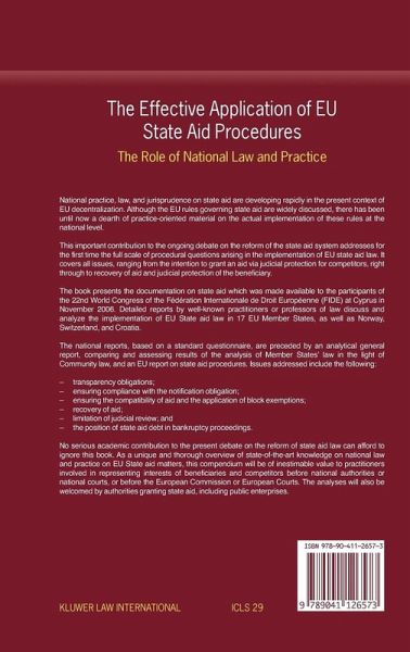 National practice, law, and jurisprudence on state aid are developing rapidly in the present context of EU decentralization. Although the EU rules governing state aid are widely discussed, there has been until now a dearth of practice-oriented material on the actual implementation of these rules at the national level. This important contribution to the ongoing debate on the reform of the state aid system addresses for the first time the full scale of procedural questions arising in the implementation of EU state aid law. It covers all issues, ranging from the intention to grant an aid via judicial protection for competitors right through to recovery of aid and judicial protection of the beneficiary. The book presents the documentation on state aid which was made available to the participants of the 22nd World Congress of the Fand#233;dand#233;ration Internationale de Droit Europand#233;enne (FIDE) at Cyprus in November 2006. Detailed reports by well-known practitioners or professors of law discuss and analyze the implementation of EU State aid law in 17 EU Member States, as well as Norway, Switzerland, and Croatia. The national reports, based on a standard questionnaire, are preceded by an analytical general report, comparing and assessing results of the analysis of Member Statesand#8217; law in the light of Community law, and an EU report on state aid procedures. Issues addressed include the following: and#8226; transparency obligations; and#8226; ensuring compliance with the notification obligation; and#8226; ensuring the compatibility of aid and the application of block exemptions; and#8226; recovery of aid; and#8226; limitation of judicial review; and and#8226; the position of state aid debt in bankruptcy proceedings. No serious academic contribution to the present debate on the reform of state aid law can afford to ignore this book. As a unique and thorough overview of state-of-the-art knowledge on national law and practice on EU State aid matters, this compendium will be of inestimable value to practitioners involved in representing interests of beneficiaries and competitors before national authorities or national courts, or before the European Commission or European Courts. The analyses will also be welcomed by authorities granting state aid, including public enterprises.