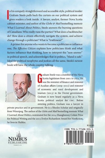 In his uniquely straightforward and accessible style, political insider Graham Steele pulls back the curtain on our political system and gives readers a look inside. A lawyer, analyst, former Nova Scotia cabinet minister, and author of the Globe & Mail bestselling memoir What I Learned About Politics, Steele answers the burning questions of Canadians: Who really runs the parties? What does a backbencher do? How does a citizen effectively navigate the system, and achieve change through a politician? What is "truthiness?" A primer for anyone who wants to become a politician or influence one, The Effective Citizen explains how politicians think and what factors influence that thinking, how to interpret the "non-answer" in political speech, and acknowledges that in politics, bland is safe." Ideal for political neophytes and junkies all the same, Steele’s newest book will have the whole country talking.