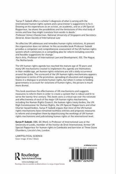 The UN human rights agenda has reached the mature age of 70 years and many UN mechanisms created to implement this agenda are themselves in their middle-age, yet human rights violations are still a daily occurrence around the globe. The scorecard of the UN human rights mechanisms appears impressive in terms of the promotion, spreading of education and engaging States in a dialogue to promote human rights, but when it comes to holding governments to account for violations of these rights, the picture is much more dismal. This book examines the effectiveness of UN mechanisms and suggests measures to reform them in order to create a system that is robust and fit to serve the 21st century. This book casts a critical eye on the rationale and effectiveness of each of the major UN human rights mechanisms, including the Human Rights Council, the human rights treaty bodies, the UN High Commissioner for Human Rights, the UN Special Rapporteurs and other Charter-based bodies. Surya P. Subedi argues most of the UN human rights mechanisms have remained toothless entities and proposes measures to reform and strengthen it by depoliticising the workings of UN human rights mechanisms and judicialising human rights at the international level.