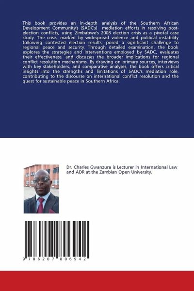This book provides an in-depth analysis of the Southern African Development Community's (SADC's) mediation efforts in resolving post-election conflicts, using Zimbabwe's 2008 election crisis as a pivotal case study. The crisis, marked by widespread violence and political instability following contested election results, posed a significant challenge to regional peace and security. Through detailed examination, the book explores the strategies and interventions employed by SADC, evaluates their effectiveness, and discusses the broader implications for regional conflict resolution mechanisms. By drawing on primary sources, interviews with key stakeholders, and comparative analyses, the book offers critical insights into the strengths and limitations of SADC's mediation role, contributing to the discourse on international conflict resolution and the quest for sustainable peace in Southern Africa.