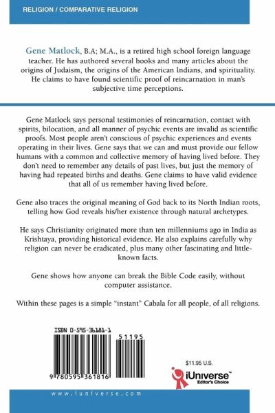Gene Matlock says personal testimonies of reincarnation, contact with spirits, bilocation, and all manner of psychic events are invalid as scientific proofs. Most people aren't conscious of psychic experiences and events operating in their lives. Gene says that we can and must provide our fellow humans with a common and collective memory of having lived before. They don't need to remember any details of past lives, but just the memory of having had repeated births and deaths. Gene claims to have valid evidence that all of us remember having lived before. Gene also traces the original meaning of God back to its North Indian roots, telling how God reveals his/her existence through natural archetypes. He says Christianity originated more than ten millenniums ago in India as Krishtaya, providing historical evidence. He also explains carefully why religion can never be eradicated, plus many other fascinating and little-known facts. Gene shows how anyone can break the Bible Code easily, without computer assistance. Within these pages is a simple 'instant" Cabala for all people, of all religions.