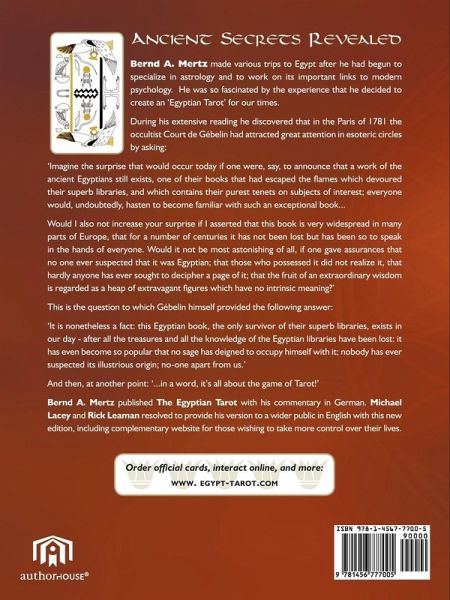 Bernd A. Mertz made various trips to Egypt after he had begun to specialize in astrology and to work on its important links to modern psychology. He tells us himself why he was so fascinated that he wished to create an 'Egyptian Tarot' for our times. During his extensive reading he discovered that in the Paris of 1781 the occultist Court de Gebelin had attracted great attention in esoteric circles by asking: 'Imagine the surprise which might occur if an Egyptian book were to be discovered today, a book from ancient Egypt which might have been spared from the flames in the burning of the famous libraries and which were to contain the deep and clearest knowledge. Would I not surprise you very much if I were to assert that this book had in fact never been lost at any time past and that it has been in the hands of, so to speak, everyone in most parts of Europe? The most astonishing thing would be if one were assured that no-one ever suspected that it was Egyptian. The fact is: this Egyptian work is the only one to have survived to the present day after all the treasures and all the knowledge of the Egyptian libraries had been lost. It has become so popular that no wise person has ever taken the trouble to think about its origin. No-one has done so apart from me.. It is the Tarot." Bernd A. Mertz decided to issue his own edition of this tarot with his commentary. Michael Lacey and Rick Leaman resolved to provide a new edition to a wider public in the English language with a website offer as a challenge for those interested to take more control over their lives.
