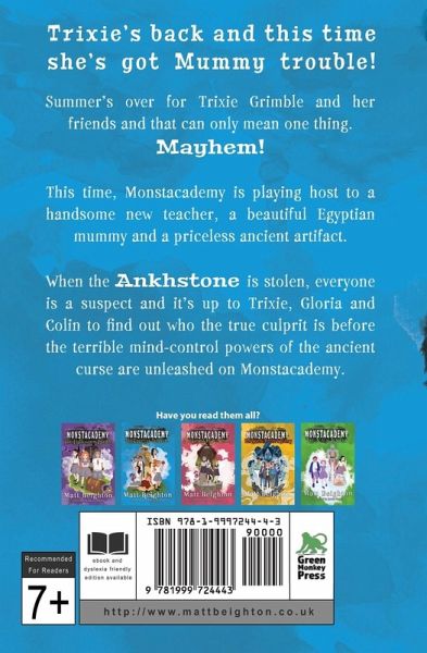 Trixie's back at Monstacademy, and this time she's got Mummy trouble! Summer's over for Trixie Grimble and her friends and that can only mean one thing. Mayhem! When a priceless treasure is stolen from the school for monsters, everyone is a suspect. It's up to Trixie, Gloria and Colin to find out who the true culprit is. If they can't solve the mystery in time, the terrible mind-control powers of the ancient curse will be unleashed on Monstacademy. Can Gloria overcome her crush in time to help Trixie and Colin wrap up the case? Also available in a dyslexia and visually impaired edition with a larger, more clearly defined font.