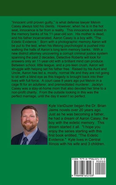 "Innocent until proven guilty," is what defense lawyer Melvin Casey always told his clients. However, when he is in the hot seat, innocence is far from a reality. This innocence is stored in the memory banks of his 11-year-old son. His mother is dead, and his father incarcerated, Aaron Casey is a boy with, "The Eidetic Evidence." Born with a photographic memory Aaron will be put to the test, when his lifelong psychologist is pushed into walking the halls of Aaron's long term memory banks. With a new district attorney uncovering a corrupt criminal justice system spanning the past 2 decades, Detective Roberts will look for answers only an 11-year-old with a brilliant mind can produce. Between school, little league, and a pre-teen crush, Aaron will struggle with helping set his father free. Raised by his Aunt and Uncle, Aaron has led a, mostly, normal life and they are not going to sit with a blind eye as this tragedy is brought back into their lives with full force. A court case 8 years ago put Melvin in a cage fit for an adulterer, and premeditated murderer. Jacklyn Casey was a stay-at-home mom that also devoted her time to a non-profit charity. From the outside looking in this was the perfect marriage, until the day it wasn't so perfect.