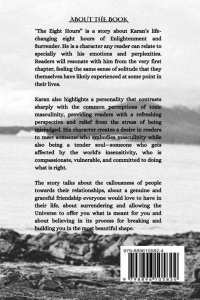 "The Eight Hours"; a fiction, is a story about Karan's life-changing 8 hours of Enlightenment and Surrender. He is a character any reader can relate to specially with his emotions and perplexities. Readers will resonate with him from the very first chapter, feeling the same sense of solitude that they themselves have likely experienced at some point in their lives. Karan also highlights a personality that contrasts sharply with the common perceptions of toxic masculinity, providing readers with a refreshing perspective and relief from the stress of being misjudged. His character creates a desire in readers to meet someone who embodies masculinity while also being a tender soul-someone who gets affected by the world's insensitivity, who is compassionate, vulnerable, and committed to doing what is right. The story talks about the callousness of people towards their relationships, about a genuine and graceful friendship everyone would love to have in their life, about surrendering and allowing the Universe to offer you what is meant for you and about believing in its process for breaking and building you in the most beautiful shape.