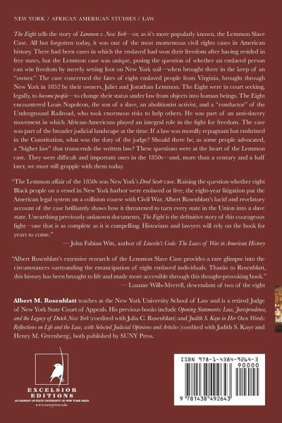The Eight tells the story of Lemmon v. New York¿or, as it's more popularly known, the Lemmon Slave Case. All but forgotten today, it was one of the most momentous civil rights cases in American history. There had been cases in which the enslaved had won their freedom after having resided in free states, but the Lemmon case was unique, posing the question of whether an enslaved person can win freedom by merely setting foot on New York soil¿when brought there in the keep of an "owner." The case concerned the fates of eight enslaved people from Virginia, brought through New York in 1852 by their owners, Juliet and Jonathan Lemmon. The Eight were in court seeking, legally, to become people¿to change their status under law from objects into human beings. The Eight encountered Louis Napoleon, the son of a slave, an abolitionist activist, and a "conductor" of the Underground Railroad, who took enormous risks to help others. He was part of an anti-slavery movement in which African-Americans played an integral role in the fight for freedom. The case was part of the broader judicial landscape at the time: If a law was morally repugnant but enshrined in the Constitution, what was the duty of the judge? Should there be, as some people advocated, a "higher law" that transcends the written law? These questions were at the heart of the Lemmon case. They were difficult and important ones in the 1850s¿and, more than a century and a half later, we must still grapple with them today.