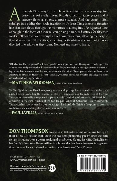 Although Time may be that Heraclitean river no one can step into twice, it's not really linear. Rapids churn in some places and it scarcely flows at others, almost stagnant. And the current often sideslips into eddies that circle indefinitely. At least Time seems to function like that as it flows through the memories of a long life. The Eightieth Year, although in the form of a journal comprising numbered entries for fifty-two weeks, follows the river through all of those variations, allowing memory to float downstream like a stick, accepting both whitewater and quiet pools, diverted into eddies as they come. No need any more to hurry.