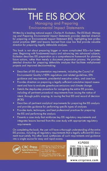 Poor Environmental Impact Statement (EIS) practice leads to poorly planned projects, and ultimately poor environmental protection. Written by recognized NEPA authority Charles H. Eccleston, The EIS Book: Managing and Preparing Environmental Impact Statements supplies focused direction on preparing an EIS, highlighting best professional practices (BBP) and lessons learned from case law that provide valuable direction for preparing legally defensible documents. The book is not about preparing bigger or more complicated EISs-but better ones. Beginning with fundamental topics and advancing into successively more advanced subjects, Eccleston describes EIS preparation as a comprehensive framework for planning future actions, rather than merely a document preparation procedure. He supplies direction for preparing defensible analyses that facilitate well-planned projects and improved decision-making. Discusses EIS document requirements including the Council of Environmental Quality's NEPA regulations and related guidelines, EPA guidance and requirements, presidential executive orders, and case law Covers how to perform a legally sufficient cumulative impact assessment and how to evaluate greenhouse emissions and climate change Details a step-by-step approach for navigating the entire EIS process that includes all pertinent process requirements from issuing the notice of intent, through public scoping, to issuing the final record of decision (ROD) Includes analytical requirements for preparing the EIS analysis and guidance for performing various types of analyses Provides tools, techniques, and best professional practices for preparing the EIS and performing the analysis Presents a case study that reinforces key EIS regulatory requirements, and integrates lessons learned from this case study with appropriate regulatory requirements The book gives readers a firm grasp of the process for preparing an EIS, including all key regulatory requirements that a legally sufficient EIS document must satisfy. No other book synthesizes all such requirements and guidance into a single source for easy and rapid access.