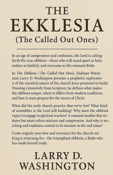 The word church has been diluted and redefined over the centuries until, for many, it means little more than a building, a weekly service, or a religious institution. But when Jesus declared, "I will build My church, and the gates of hell shall not prevail against it" (Matthew 16:18), He did not use the word church at all. He used the Greek word ekklesia-a word that means "the called-out ones." The ekklesia is not an organization; it is an organism. It is not a place you go but a people you belong to. It is the Body of Christ-redeemed, separated, and filled with the Spirit to shine as light in the midst of darkness. In The Ekklesia (The Called Out Ones), Larry D. Washington takes readers on a biblical journey from the first mention of the ekklesia in Matthew 16 to the victorious, overcoming Bride of Christ revealed in Revelation. This book exposes the difference between the true church and the counterfeit system rising in these last days and calls every believer to walk in holiness, obedience, and readiness for the return of Christ. Inside these pages you will discover:The true meaning of ekklesia and why Jesus chose that word. How Israel in the Old Covenant foreshadowed the calling of the ekklesia. The early church pattern of power, persecution, and purity. Why holiness is the mark of the called-out ones. The balance of the Spirit's gifts and fruit in the life of the church. How to live as ambassadors of the Kingdom in a fallen world. The difference between the remnant Bride and the apostate church. What it means to "come out from among them" (2 Corinthians 6:17). Why the true church may have "little strength" (Revelation 3:8), yet great reward. How the Bride prepares herself for the Bridegroom's return. With clarity, urgency, and deep scriptural insight, Washington shows that the ekklesia is not defined by its size, wealth, or popularity, but by its loyalty to Christ and His Word. In a generation obsessed with blending in, the true church is called to stand out. In a world sliding deeper into compromise, the ekklesia must remain holy. In an age of deception, the remnant must cling to the truth. This book is a trumpet blast to the last-days church. It warns of the rise of the counterfeit religious system, while strengthening and equipping the faithful remnant to endure, overcome, and shine. It reminds every believer that the Bridegroom is coming, and only those who are watching and ready will enter the marriage supper of the Lamb.
