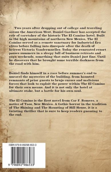 Two years after dropping out of college and traveling across the American West, Daniel Gardner has accepted the role of caretaker of the historic The El Camino hotel. Built in the high mountains of northern New Mexico, The El Camino served as a remote sanctuary for Industrial Era elites before falling into disrepair after the death of heiress Victoria Vandermueller. Today the renovated resort passes summers in a sleepy lull of business retreats and yoga weekends, something that suits Daniel just fine. Until the night he discovers that he brought some terrible darkness from the road with him. Daniel finds himself in a race before summer's end to unravel the mysteries of the building, from haunted remnants of prior guests to brujo curses and malicious forces that look to exploit the power within The El Camino for their own means. And it is not only the hotel at ultimate stake, but a battle for his own soul. The El Camino is the first novel from Car F. Romero, a native of Taos, New Mexico. A Gothic horror in the tradition of The Shining and The Haunting of Hill House, this twisting thriller is sure to keep readers guessing to the end.