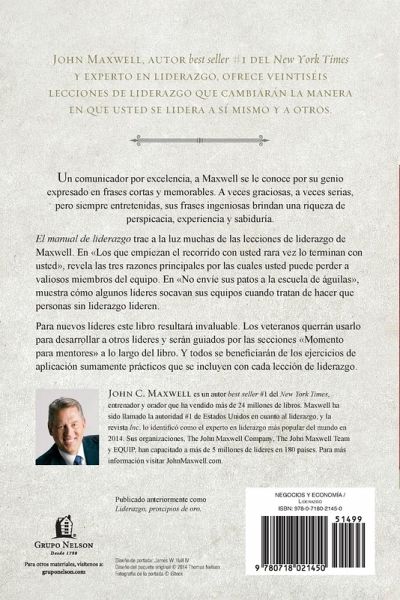 El autor de best sellers del New York Times y experto en liderazgo, John Maxwell, ofrece una perspectiva pr¿¿ctica para aprender c¿¿mo liderar a la persona que m¿¿s importa: usted mismo. El camino hacia el liderazgo comienza con una pregunta que pocos nos hacemos: ¿¿C¿¿mo me lidero a m¿¿ mismo? John Maxwell presenta veintis¿¿is ideas, no s¿¿lo para quienes aspiran a posiciones de liderazgo sino tambi¿¿n para l¿¿deres veteranos que tienen la meta de construir y mejorar sobre los pasos que les llevaron a estar al frente. Un liderazgo sano influenciar¿¿ cualquier tarea, pero los l¿¿deres sensatos est¿¿n preparados para el riesgo, y de modo importante, el fracaso, mientras se¿¿alan el camino hacia el logro. Con ejercicios de aplicaci¿¿n y un ¿¿Momento para mentores¿¿ que acompä¿a a cada cap¿¿tulo, El manual de liderazgo presenta un mapa de ruta de un camino que muchos cruzan pero pocos deciden seguir. ¿¿Un l¿¿der --aconseja Maxwell-- nunca tiene que recuperarse de un buen comienzö¿.