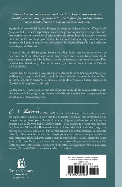 Conocida como la primera novela de C. S. Lewis, esta elocuente, erudita y a menudo ingeniosa s¿¿tira de la filosof¿¿a contempor¿¿nea sigue siendo relevante m¿¿s de 90 ä¿os despu¿¿s. Siguiendo el modelo del famoso Progreso del peregrino de John Bunyan, El regreso del peregrino de C. S. Lewis representa una serie de primicias para Lewis: el primer libro que escribi¿¿ tras su conversi¿¿n al cristianismo, su primer libro de ficci¿¿n y el primer libro que public¿¿ con su propio nombre. En cierto sentido, es el registro de la propia b¿¿squeda de Lewis de sentido y satisfacci¿¿n espiritual, una b¿¿squeda que finalmente le condujo al cristianismo. Esta es la historia del peregrino Juan y su odisea hacia una isla encantadora que ha creado en ¿¿l un intenso anhelo; un misterioso y dulce deseo. La persecuci¿¿n de este deseo por parte de Juan le lleva a trav¿¿s de aventuras con personas como el Sr. Ilustraci¿¿n, Media Media, el Sr. Mam¿¿n, el Sr. Sensato y el Sr. Humanista, y a trav¿¿s de lugares como el Valle de la Humillaci¿¿n. Aunque aqu¿¿ los dragones y los gigantes son distintos de los de El progreso del peregrino de Bunyan, la alegor¿¿a de Lewis cumple la misma funci¿¿n de permitir al autor decir de forma sencilla y mediante la fantas¿¿a lo que de otro modo habr¿¿a exigido una filosof¿¿a de la religi¿¿n en toda regla. La alegor¿¿a de Lewis sigue siendo una ingeniosa s¿¿tira de las modas culturales, un v¿¿vido relato de los peligros espirituales y una historia iluminadora para generaciones de antiguos y nuevos peregrinos. The Pilgrim's Regress Known as C. S. Lewis's first novel, this eloquent, erudite, and often wittysatire of contemporary philosophy is still relevant over 90 years later. Modeled after John Bunyan's famous Pilgrim's Progress, C. S. Lewis's Pilgrim's Regress represents several firsts for Lewis--the first book he wrote after his conversion to Christianity, his first book of fiction, and the first book he published under his own name. It is, in a sense, the record of Lewis's own search for meaning and spiritual satisfaction--a search that eventually led him to Christianity. Here is the story of the pilgrim John and his odyssey to an enchanting island which has created in him an intense longing; a mysterious, sweet desire. John's pursuit of this desire takes him through adventures with such people as Mr. Enlightenment, Media Halfways, Mr. Mammon, Mother Kirk, Mr. Sensible, and Mr. Humanist and through such cities as Thrill and Eschropolis as well as the Valley of Humiliation. Though the dragons and giants here are different from those in Bunyan's Pilgrim's Progress, Lewis's allegory performs the same function of enabling the author to say simply and through fantasy what would otherwise have demanded a full-length philosophy of religion. Lewis's allegory remains a witty satire on cultural fads, a vivid account of spiritual dangers, and an illuminating tale for generations of pilgrims old and new.