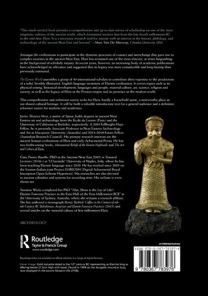 The Elamite World assembles a group of 40 international scholars to contribute their expertise to the production of a solid, lavishly illustrated, English language treatment of Elamite civilization. It covers topics such as its physical setting, historical development, languages and people, material culture, art, science, religion and society, as well as the legacy of Elam in the Persian empire and its presence in the modern world.