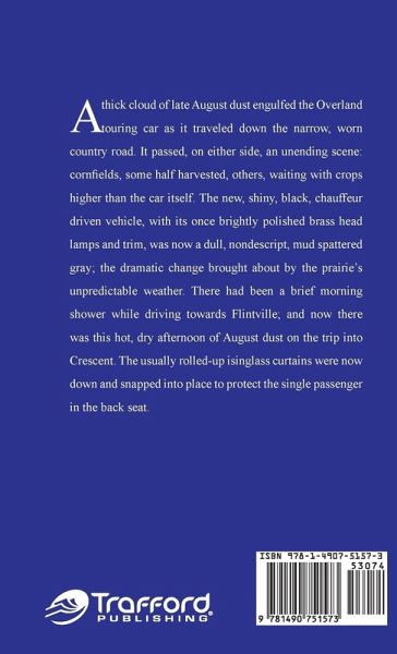 A thick cloud of late August dust engulfed the Overland touring car as it traveled down the narrow, worn country road. It passed, on either side, an unending scene: cornfields, some half harvested, others, waiting with crops higher than the car itself. The new, shiny, black, chauffeur driven vehicle, with its once brightly polished brass head lamps and trim, was now a dull, nondescript, mud spattered gray; the dramatic change brought about by the prairie's unpredictable weather. There had been a brief morning shower while driving towards Flintville; and now there was this hot, dry afternoon of…mehr