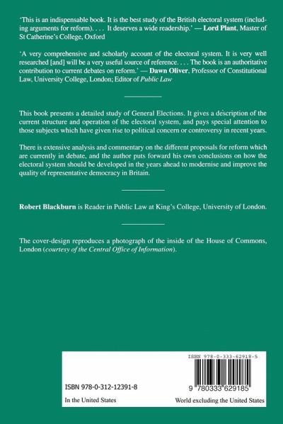 This excellent new book provides a comprehensive account of the British system of parliamentary elections. It contains a description of the current structure and operation of the electoral system, and pays special attention to those subjects which have given rise to political concern or controversy in recent years. There is extensive analysis and commentary upon the different proposals for reform which are currently in debate, and the author puts forward his own conclusions on how the electoral system should be developed in the years ahead to modernise and improve the quality of representative democracy in Britain.